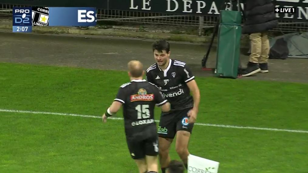 Brive attaque fort la rencontre. A la réception du coup d'envoi, les brivistes gardent la possession et enclenchent une longue possession. Les passes et les courses se multiplient. Tout le monde touche la balle, on passe d'un côté à l'autre, on alterne entre avants et 3/4. La défense est au point de rupture. Le ballon est écarté et Stuart Olding décale Benjamin Lefranc, esseulé dans son couloir qui marque en coin (5-0, 4').