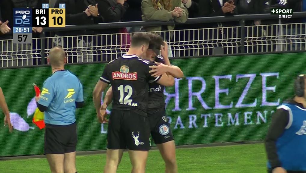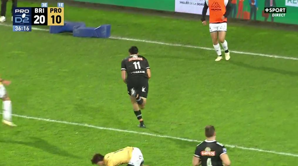Après avoir plus que tenu tête aux brivistes pendant un peu moins de 30 minutes, Provence est en train d'exploser dans ces dernières minutes de la première partie. Jouer c'est bien mais ne pas prendre trop de risques, c'est encore mieux. Sauf que là, Provence n'assure pas une passe vers les extérieurs, Lefranc intercepte et plus personne ne le reverra (27-10, 37').