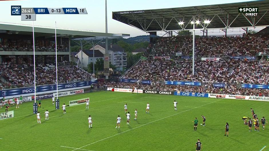 Tout un stade espère que désormais, Brive est entré dans sa demie et que la remontada va s'enclencher. Oui mais non ! Si les brivistes parviennent à trouver de bonnes touches, en face, il y a Bosviel qui renvoie tout le monde dans l'autre moitié de terrain. Dans le désordre, Bosch trouve des espaces et combine avec Moroni. Dans le jeu au sol, Quercy est sanctionné mais il subit un déblayage rugueux de Simon-Pierre Chauvac. Après vidéo, le déblayage est dangereux et jaune pour le pilier briviste (31'). Comme très (trop) souvent cette saison, Brive évolue en infériorité numérique. Cela n'empêche pas la mêlée briviste de prendre le dessus et de convertir la pénalité en pénaltouche sur les 22 mètres de Montauban. Sauf qu'on lit le lancer vers Retief Marais et le lancer est contré. Brive reste malgré tout dans les 22 mètres. Brive insiste sur un ballon porté sauf que voilà, Montauban est prêt à répondre au défi physique et le capitaine Quercy enterre le ballon dans le maul (37'). A la sirène, les avants s'essaient à nouveau mais encore une fois, les avants montalbanais passent par l'axe et annulent le ballon porté des brivistes. A la pause, Brive est mené et passe à côté de sa demi-finale. Pour le moment, Montauban est parfait et doit continuer ainsi.