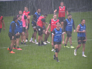 En une semaine, tout le panorama à Brive a bien changé. Nous sommes passés d'un beau soleil et d'une équipe en confiance après deux victoires de suite obtenues à la maison à une météo très pluvieuse et une équipe qui se pose des questions après la lourde défaite concédée à Agen. Comme après Biarritz, l'équipe devra réagir à domicile et mettre avant tout l'engagement et l'intensité qui ont manqué vendredi. Chacun tente de trouver les solutions pour éviter de revivre le même scénario : les entraineurs donnent plus de la voix et les joueurs mettent un peu plus d'intensité (quitte à provoquer quelques étincelles par moments). Les conditions de jeu étaient loin d'être évidentes avec une savonnette à la place du ballon, un terrain gras et bien humide et une pluie continue et bien intense pendant quelques minutes. Il ne faisait pas bon mettre un rugbyman dehors mais peu importe la météo, l'entrainement doit avoir lieu. Si la plupart de ses compatriotes ont déjà repris il y a deux semaines ou le week-end dernier, Francisco Coria Marchetti a de bonnes chances de commencer sa saison avec Brive face à Soyaux-Angoulême. Henco Venter pourrait aussi connaitre ses débuts avec le CAB. A voir si Georges Shvelidze va débuter, lui qui a joué avec les Espoirs à La Rochelle. Pour recevoir Soyaux-Angoulême, le staff ne va pas procéder à quinze changements mais forcément qu'il y aura encore plusieurs changements. Espérons que petit à petit, l'équipe trouve de la traction malgré que l'équipe de départ change de moitié à tous les matchs.