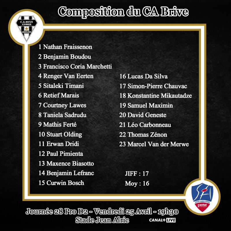 Pour ce déplacement, Brive ne fait pas totalement tourner mais procède à plusieurs changements. La première ligne est changée avec les titularisations de Nathan Fraissenon, Francisco Coria Marchetti et du retour de blessure de Benjamin Boudou. Renger Van Eerten et Sitaleki Timani forment la 2e ligne. Retief Marais retrouve la 3e ligne avec Taniela Sadrugu en numéro 8. Paul Pimienta est titulaire au centre avec Maxence Biasotto. Benjamin Lefranc prend place à l'aile. A noter le retour de Léo Carbonneau sur le banc après sa blessure à l'épaule à Oyonnax.
