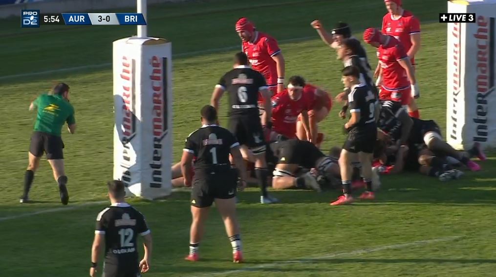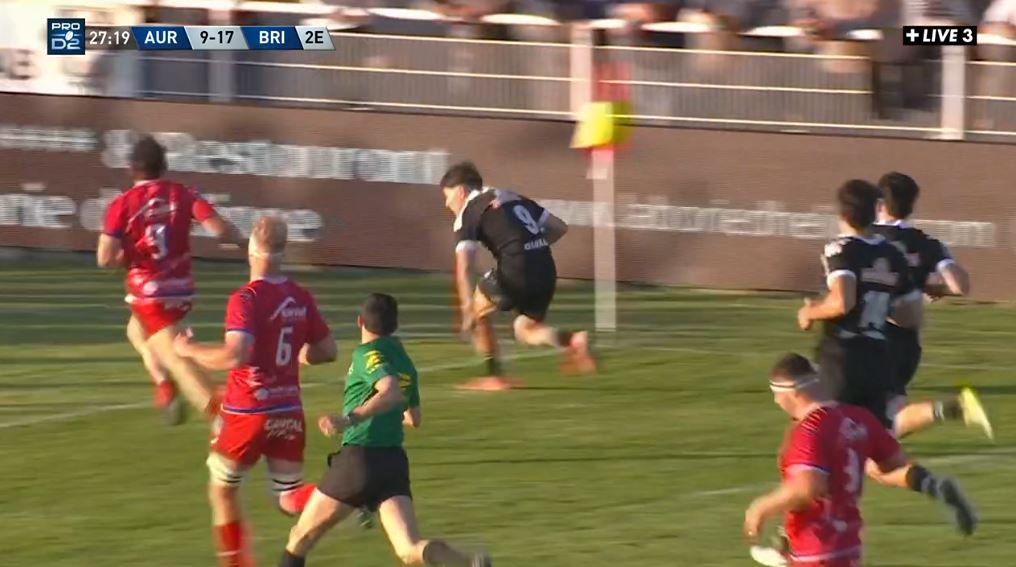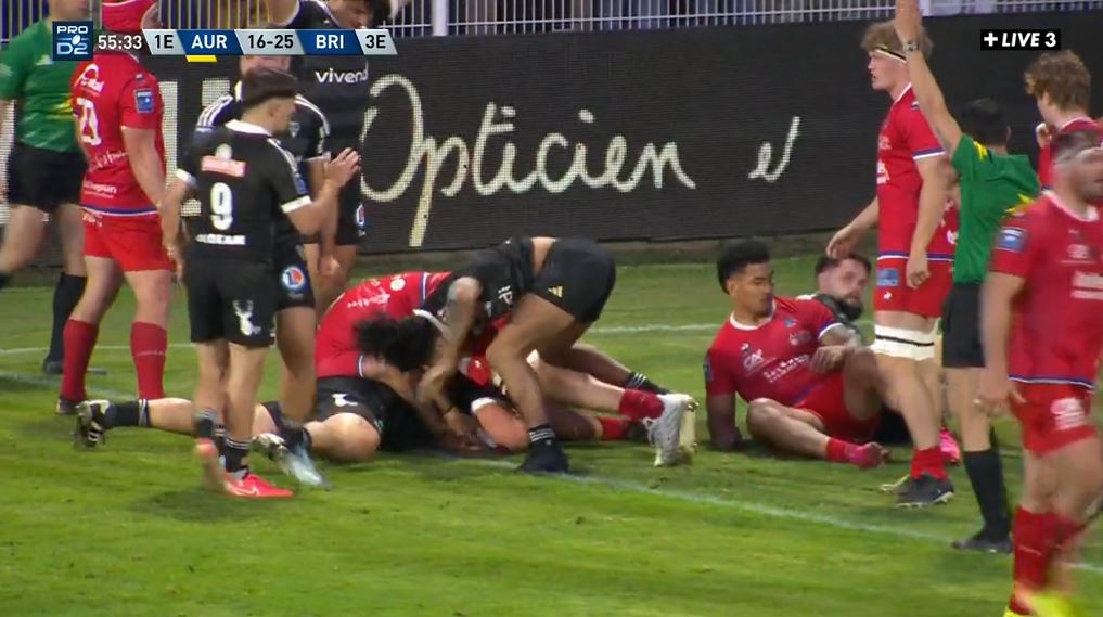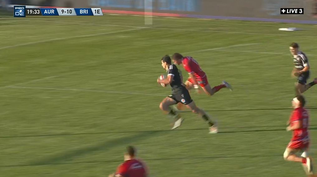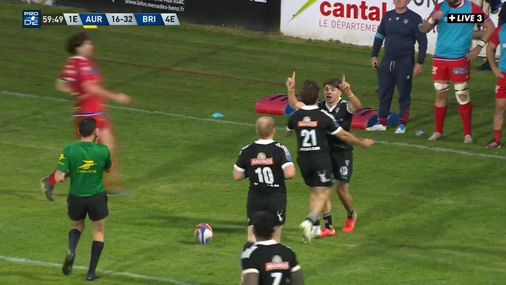 Brive ne s'arrête pas là ! Curwin Bosch est lancé dans l'intervalle par Stuart Olding. L'arrière trouve du soutien. Mathis Ferté joue au pied, c'est récupéré par Nathan Fraissenon qui aplatit dans l'en-but. Après vidéo, l'essai est refusé car Erwan Dridi se trouvait devant son demi de mêlée au moment de son coup de pied (23'). Là où on se rencontre qu'on regarde entre une équipe qui lutte pour sa survie et une autre qui vise le Top 14, c'est l'utilisation des ballons de récupération. Premièrement, Aurillac ne trouve pas une pénaltouche. Deuxièmement, la chandelle tombe directement sur Taniela Sadrugu qui a tout le temps du monde d'assurer la réception et de lancer le contre. Il accélère et sert Biasotto. A nouveau, le centre fait la différence et passe après contact à Ferté qui termine en coin pour le 3e essai briviste (9-22, 29').