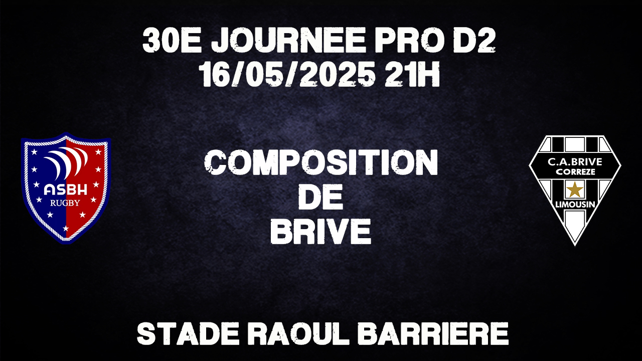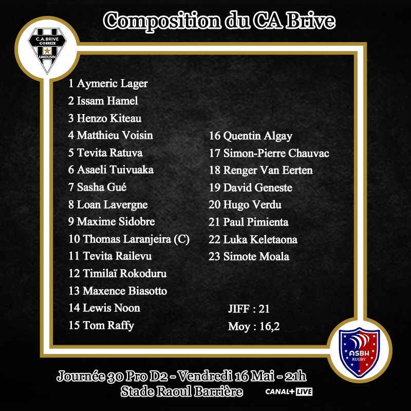 Pour ce déplacement, Brive fait une très grosse revue d'effectif. Peu des 23 de Grenoble sont reconduits. Ainsi en première ligne, on retrouve Aymeric Lager, Issam Hamel et Henzo Kiteau. En 2e ligne, le duo Matthieu Voisin et Tevita Ratuva (de retour de suspension) est aligné. En troisième, c'est le trio Sasha Gué - Asaeli Tuivuaka - Loan Lavergne qui débute la rencontre. Maxime Sidobre et Tom Raffy sont à la charnière. Au centre, nous avons Timilaï Rokoduru et Maxence Biasotto. Tevita Railevu et Lewis Noon, pour ses débuts en pro, sont placés aux ailes. Thomas Laranjeira enchaine et n'est pas encore à la retraite ! En plus de Lager et Noon, Luka Keletaona et Simote Moala vont faire leur début avec Brive.
