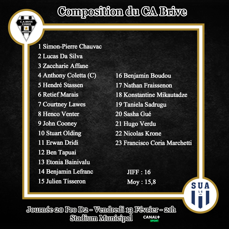 Pour cette réception, Brive change presque tout par rapport au dernier match, en ne gardant que 5 joueurs (Coletta, Lawes, Cooney, Olding et Tisseron). Nouvelle première ligne avec la titularisation pour Simon-Pierre Chauvac, Lucas Da Silva et Zaccharie Affane. Hendré Stassen démarre en 2e ligne. Retief Marais est de retour en 3e ligne, avec Henco Venter en numéro 8. Stuart Olding est décalé à l'ouverture. Nouvelle ligne de 3/4 avec Erwan Dridi, Ben Tapuai, Etonia Bainivalu et Benjamin Lefranc. Julien Tisseron bascule à l'arrière.