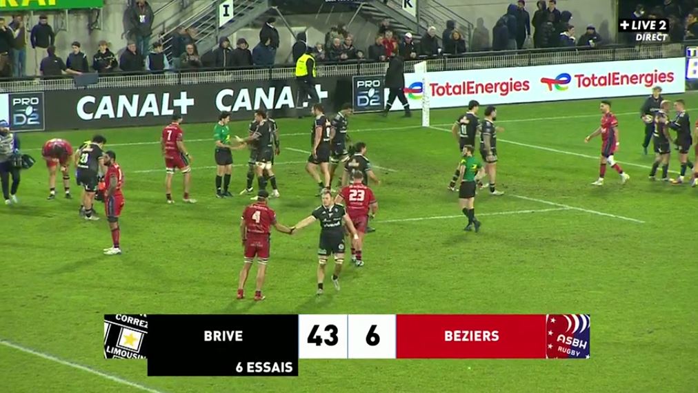 Un dernier ballon envoyé dans les tribunes et c'est la fin du match. Après un premier acte pas très bon, Brive a su rectifier la marque dans la dernière demi-heure pour s'offrir un nouveau succès bonifié. Béziers continue son chemin de croix en déplacement malgré 50 bonnes premières minutes du côté du Stadium.