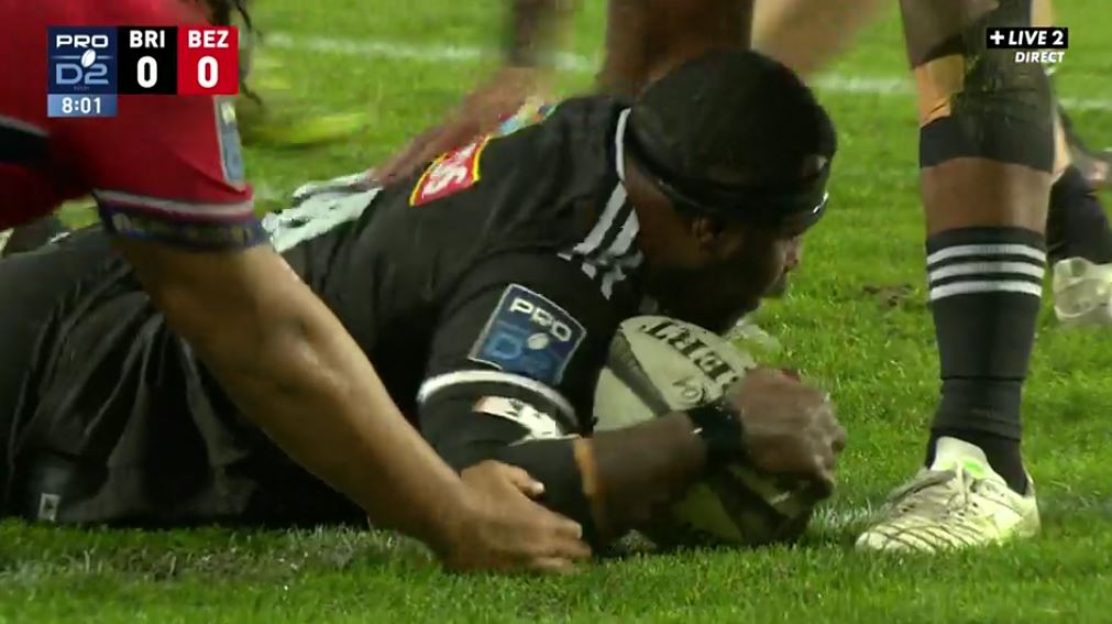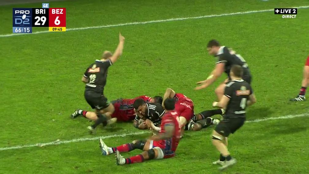Cette fois, c'est sûr : Béziers ne reviendra pas au score et semble bel et bien rendre les armes. Encore plus avec ce qu'il se passe quelques minutes après le 4e essai briviste. Les avants travaillent au près à la suite d'une pénaltouche. Hugo Verdu tente d'ouvrir au large mais Samuel Marques tape dans le ballon. Pour cette faute cynique, l'ancien briviste écope d'un carton jaune (66'). A cinq mètres, le CAB décide de jouer à la main avec Tuivuaka en premier attaquant. S'il est repoussé, Verdu lit parfaitement la défense, inverse le jeu avec Taniela Sadrugu qui vient en croisée pour prendre la défense à revers et marquer son essai (36-6, 67').
