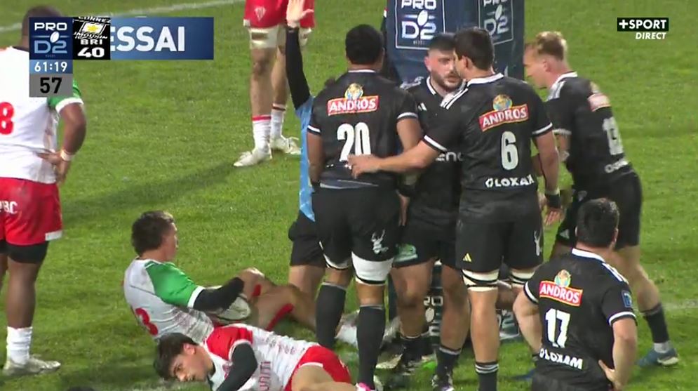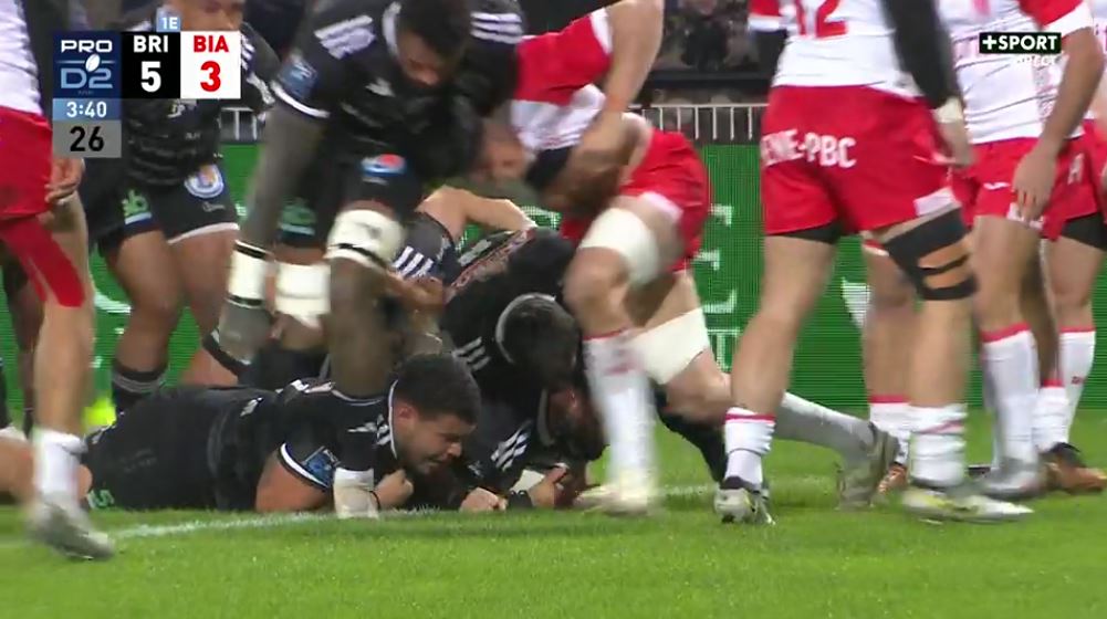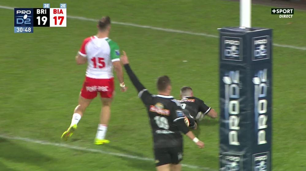 Les brivistes continuent d'étouffer les biarrots avec le jeu d'avants et la conquête. La mêlée briviste domine son homologue et obtient une nouvelle pénalité, de quoi se rapprocher de l'en-but avec une pénaltouche. La tactique envoie le ballon sur le dernier bloc mais Marais reste toujours très sûr dans ses prises de balle. Le maul se forme et c'est Nathan Fraissenon qui pointe dans l'en-but (19-3, 20').