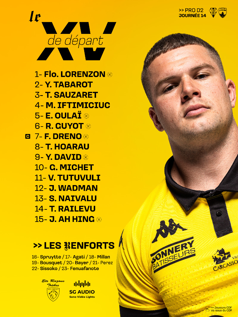 Voici le XV de départ de Carcassonne pour le déplacement à Brive :