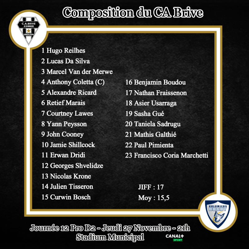 Voici le XV de départ du CA Brive pour la réception de Colomiers :