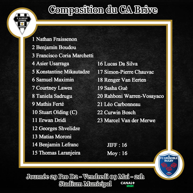 Voici le XV de départ du CA Brive pour la réception de Grenoble :