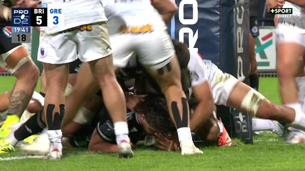 Tout va bien pour le moment pour le CAB qui a fait ce premier break dans la partie. Attention tout de même à Grenoble qui continue d'attaquer et de se montrer dangereux. Les avants sont utilisés pour avancer dans l'axe et sur le renversement, Julien Farnoux dépose un jeu au pied dans le dos de la défense. John Cooney ne peut rien faire face aux flèches Hugo Trouilloud et Raffaele Costa Storti. C'est le premier cité qui marque en coin et relance son équipe (14-8, 36'). Sur le renvoi, une action suspecte attire l'oeil du corps arbitral. Après avoir tout vu, Mr Urruzmendi sanctionne le plaquage haut de Courtney Lawes d'un carton jaune (38'). Sur la sirène, nouvel appel à la vidéo mais cette fois, rien n'a signalé. A la pause, Brive mène mais Grenoble n'est pas décroché et entend bien jouer sa carte à fond.