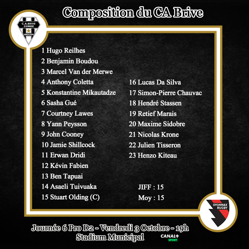 Voici le XV de départ du CA Brive pour la réception d'Oyonnax :