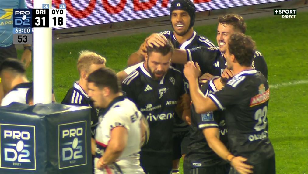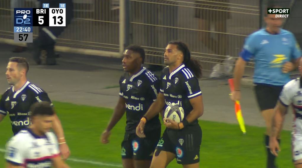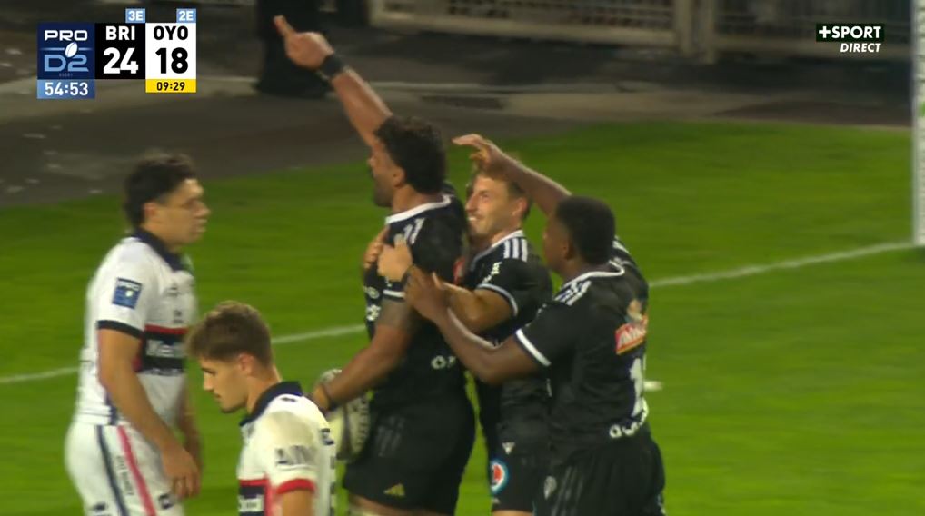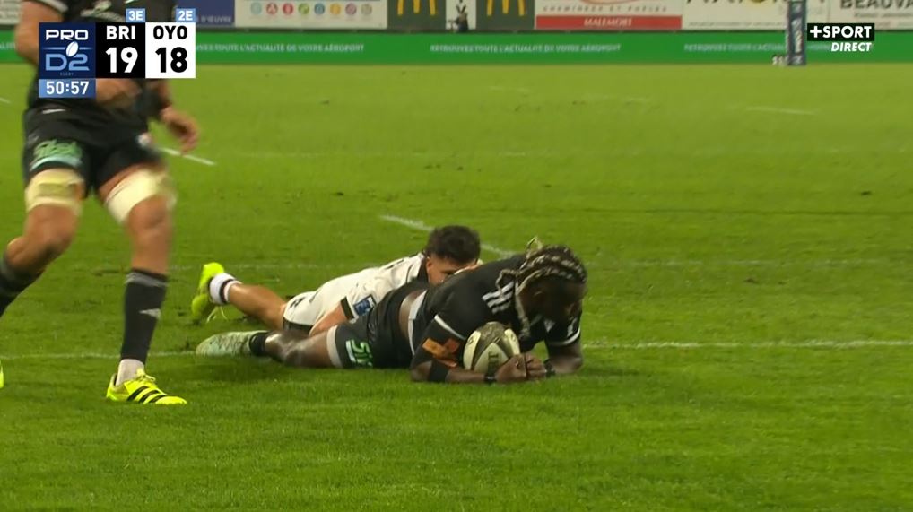 Brive est transformé et se voit pousser des ailes ! Depuis ses 22 mètres, Stuart Olding lance le contre, attaque la ligne et franchit la défense. Il retrouve au soutien Maxime Sidobre et Erwan Dridi qui font un point de fixation dans les 22 d'Oyonnax. Le ballon vit et va sur l'aile opposée. Benjamin Boudou passe en mouvement à Asaeli Tuivuaka qui fait parler sa puissance pour se défaire du dernier défenseur et marquer son essai (19-18, 50').