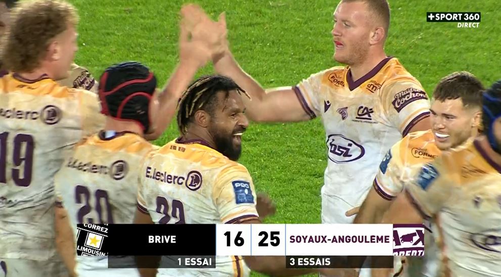 Après Biarritz, Brive avait su réagir en l'emportant face à Grenoble et en retrouvant son engagement et son intensité. Après Agen, Brive se retrouve dans la même situation. Sauf que là, cela ne va pas se passer comme prévu. Soyaux-Angoulême ne lâche rien et se montre efficace offensivement, en profitant des erreurs brivistes. Brive va mener 16 à 10 à la demi-heure de jeu mais cela sera les derniers points brivistes de la soirée. Brive est brouillon, sans beaucoup d'idées offensivement et surtout, l'équipe s'enferme à ne pas tenter les pénalités et forcer le destin sur les pénaltouches. A ce petit jeu, c'est la défense angoumoisine qui sort vainqueur du duel. Les doutes autour de l'équipe et du staff ne font que grandir et le déplacement à Provence vendredi prochain va sentir la poudre car le feu commence à prendre du côté du Stadium.