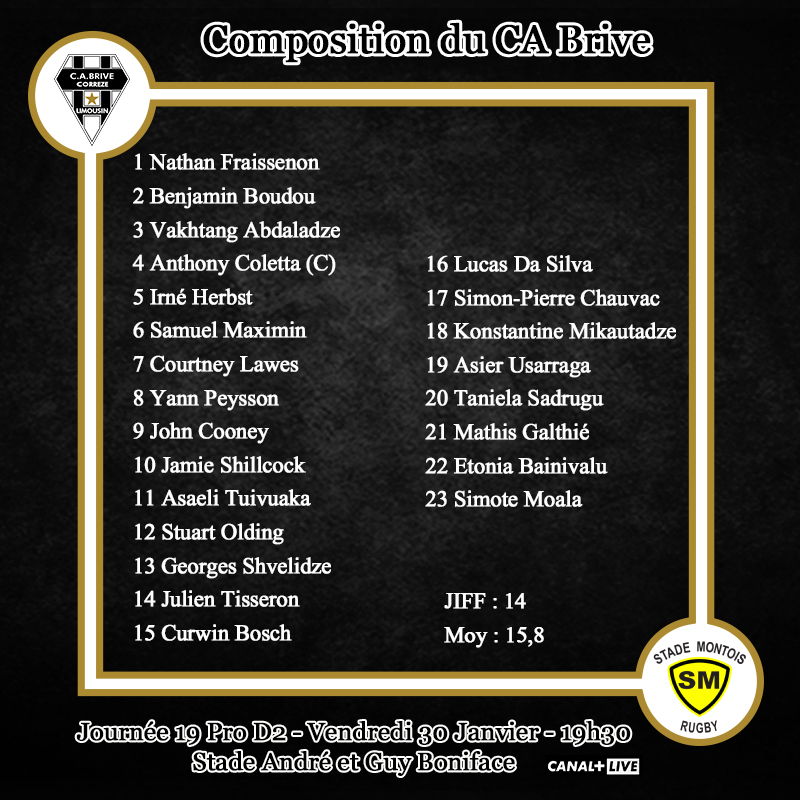 Voici le XV de départ du CA Brive pour le déplacement à Mont de Marsan :
