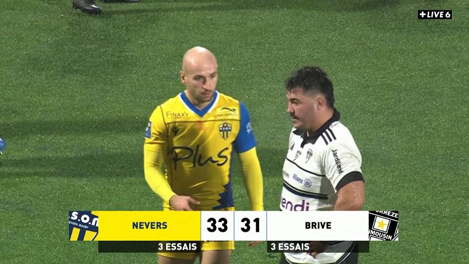 Plus que 20 minutes à jouer et personne ne peut dire qui va remporter la rencontre. Cela va se jouer sur des détails et sur des erreurs. Shillcock est tout proche d'en faire une grosse, en attendant jusqu'au dernier moment avant d'aplatir dans son en-but, Mayo a été tout proche de s'offrir un triplé. A l'image de Sadrugu, Noah déchire la défense et il faut le gros retour de Tuivuaka pour provoquer la perte de balle du 3e ligne de Nevers (61'). La conquête briviste est toujours dominante avec une nouvelle pénalité pour la mêlée, une touche volée par Samuel Maximin et un ballon gratté par Asier Usarraga. Mais voilà, l'édifice commence à se fissurer avec Henzo Kiteau qui se retrouve dans le viseur de l'arbitre, avec un ballon perdu en touche après un très beau 50-22 trouvé par Lewis Noon. Sadrugu et Tuivuaka remettent l'équipe dans le bon sens mais un en-avant vient stopper l'action. Derrière, c'est au tour de Hugo Reilhes de se faire sanctionner. Nevers n'en profite et se met à la faute bêtement en percutant Tisseron après son coup de pied. A 40 mètres, Shillcock remet Brive en tête (30-31, 75'). Sur le renvoi, Brive est fébrile et commet un en-avant. Sur la mêlée, c'est à nouveau Nevers qui prend le dessus et obtient la pénalité. Tout juste entré, Simon Tarel ne tremble pas et passe la pénalité (33-31, 77'). Brive met ses dernières forces sur le terrain pour aller chercher la victoire. Le CAB tient le ballon sur les 40 adverses et avance petit à petit. Le stress est à son comble alors que Brive fait du jeu axial pour provoquer la faute neversoise. Sur les 22 mètres, Brive insiste mais attention à ne pas s'isoler. Reilhes charge mais Noah était prêt pour venir gratter le ballon. Nevers gagne la pénalité, valide cette victoire obtenue de haute lutte et conserve son invincibilité à domicile. Brive, pour une fois, ne rentre pas bredouille d'un déplacement mais il y a de la frustration ne pas repartir avec la victoire.