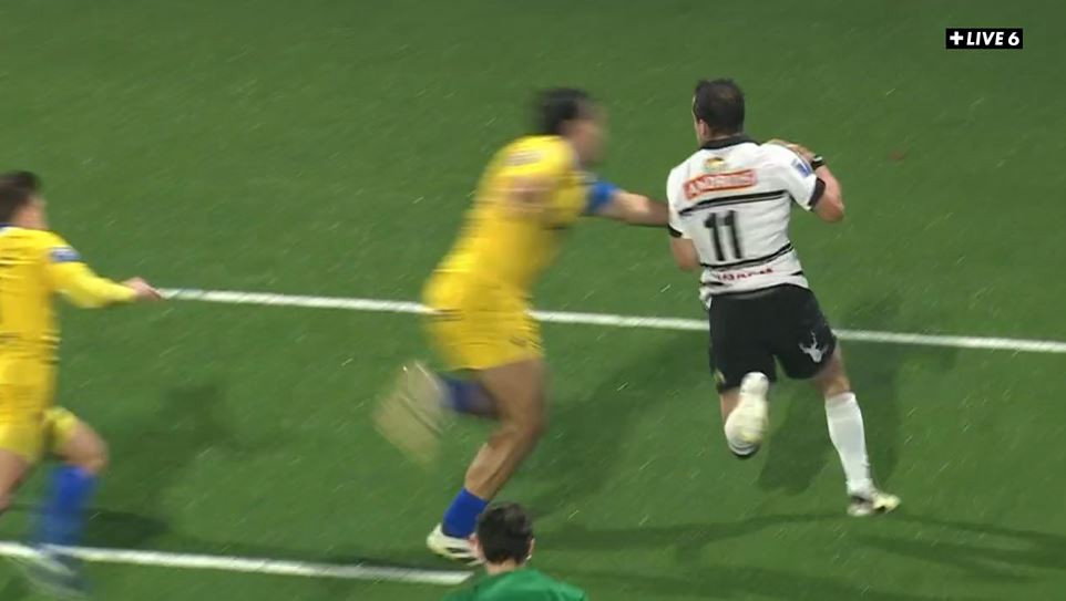 Sur la première mêlée de la rencontre, Brive prend le dessus mais se retrouve sanctioné pour une poussée en travers. Yohan Le Bourhis réduit le score (3-10, 14'). Malgré ces premiers points locaux, c'est Brive qui continue de dominer ce début de match. Après la première ligne, c'est au tour des centres de mettre l'équipe dans l'avancée. Etonia Bainivalu s'en charge. Derrière, la passe pivot de Boudou est loin d'être parfaite pour Shillcock mais il parvient à contrôler le ballon et à alerter Curwin Bosch. L'arrière accélère et sert Asaeli Tuivuaka. Dans son couloir, le fidjien est inarrêtable et s'en va marquer son essai en coin (3-15, 17').
