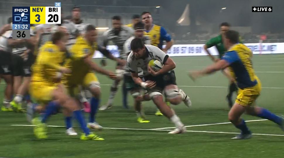 Brive est en confiance et ne veut pas en rester là. Les avants font parler leur maitrise du maul pour enfoncer la défense de Nevers mais en passant au sol, un en-avant est commis. Sur la mêlée, Brive emporte tout sur son passage, récupère le ballon et Retief Marais s'en saisit et s'en va marquer son essai (3-22, 22').