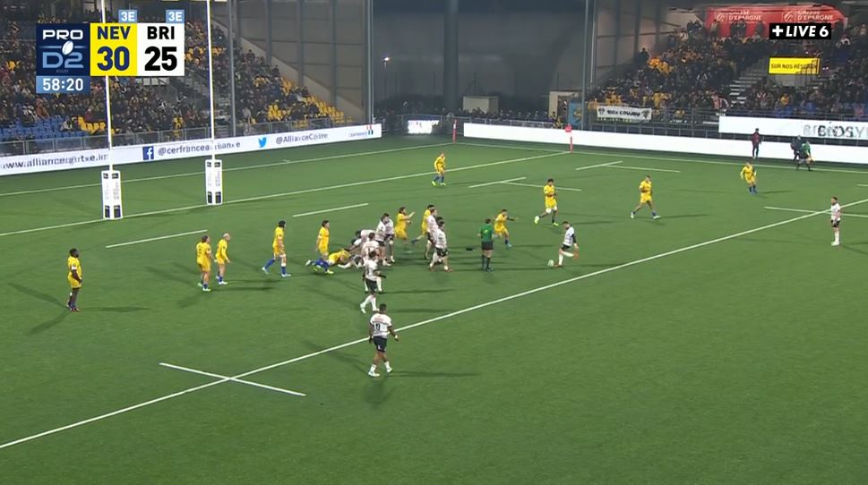 L'alarme incendie retentit mais les joueurs se maintiennent en température. Nevers et Brive ont beaucoup de choses encore à jouer durant cette seconde période. Nevers pousse à la faute le pack briviste sur un maul et Le Bourhis rapproche toujours un peu plus les siens (20-22, 45'). Brive est redoutable ce soir en mêlée, en renversant à nouveau son adversaire dans cet exercice. Malheureusement, de l'autre côté, cela ne concrétise pas les temps forts. Hugo Bouyssou vient chasser Jamie Shillcock qui ne peut dégager correctement. Nevers se retrouve alors proche de la ligne briviste et va trouver la faille au large. A nouveau, Jaminet alerte Mayo qui s'offre un doublé (27-22, 52'). Cela a mis du temps mais Nevers prend les commandes de la rencontre et vient de remonter les 19 points d'écart d'il y a 30 minutes. Le banc briviste doit faire la différence. Taniela Sadrugu se lance depuis ses 40 mètres et passe à travers la défense. Il est mis au sol à l'entrée des 22 mètres. Mathis Galthié voit un espace et s'en va marquer le 4e essai briviste. La joie va être de courte durée car après vidéo, l'essai est refusé pour une faute d'Alexandre Ricard. On revient à une pénalité sur les 22 mètres et Shillcock passe la pénalité (27-25, 53'). Sur le renvoi, Nevers met la pression sur Brive et récupère une touche. Derrière, Brive se met à la faute et Le Bourhis remet cinq points d'écart en faveur de son équipe (30-25, 56'). A nouveau sur le renvoi, c'est désormais au tour de Brive de mettre la pression grâce à Tuivuaka. On opte pour la pénaltouche à 5 mètres. Brive insiste devant mais la défense parvient à repousser l'offensive. Face aux perches, à l'entrée des 22 mètres, Jamie Shillcock se recule légèrement et claque le drop (30-28, 59').