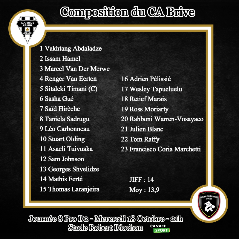 Pour ce déplacement, Brive garde son ossature vue face à Grenoble, en apportant quelques changements. Renger Van Eerten est titulaire en 2e ligne. Saïd Hirèche va connaitre sa 3e titularisation de la saison. Pour Taniela Sadrugu, ce sera sa 1ere après ses débuts face à Grenoble. Après son essai vendredi, Georges Shvelidze est titulaire au centre. De retour de blessure, Asaeli Tuivuaka reprend place à l'aile.