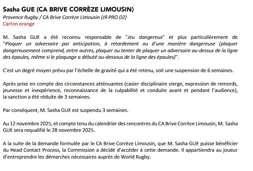 Mais le carton orange est identique à un carton rouge au moment de la commission de discipline et après le passage devant celle-ci, Sasha Gué écope d'une suspension de 6 semaines pour jeu dangereux, réduite à 3. Il a manqué la réception de Mont de Marsan et va manquer les matchs contre Béziers et Colomiers. Mais Gué pourrait faire son retour face à Colomiers en effectuant le traditionnel "stage World Rugby" qui permet d'éliminer un match de suspension.