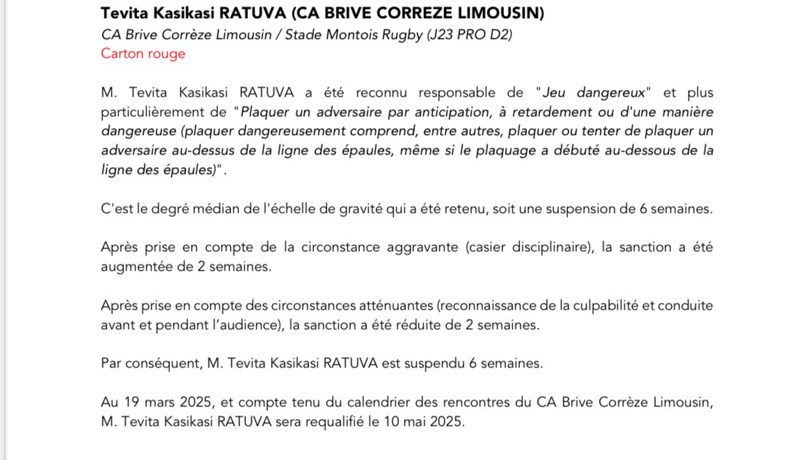 Après passage devant la commission de discipline, Tevita Ratuva écope d'une suspension de 6 semaines pour jeu dangereux. Il va ainsi manquer les matchs contre Montauban, Valence-Romans, Agen, Provence, Aurillac et Grenoble. Il pourra rejouer contre Béziers lors de la dernière journée de la phase régulière.