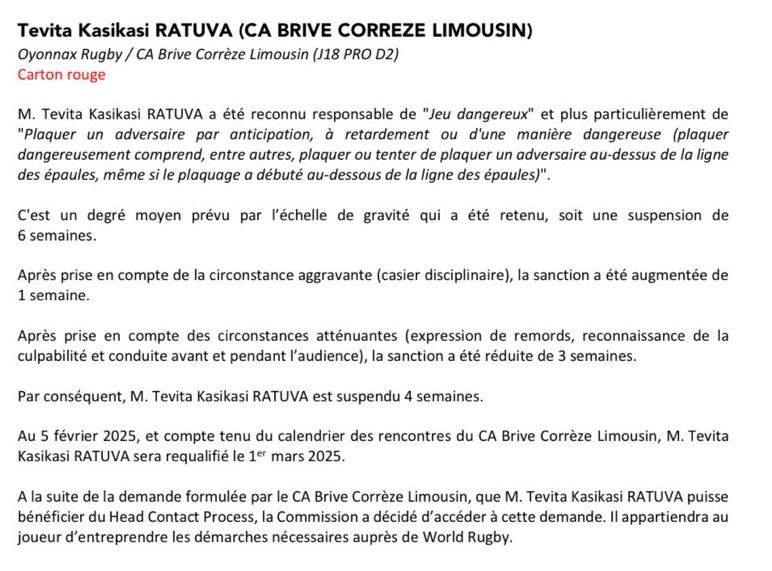 Après passage devant la commission de discipline, Tevita Ratuva écope d'une suspension de 4 semaines pour jeu dangereux. Il va ainsi manquer les matchs contre Soyaux-Angoulême, Nice et Biarritz. En effectuant le protocole World Rugby, il pourra rejouer contre Colomiers.