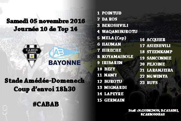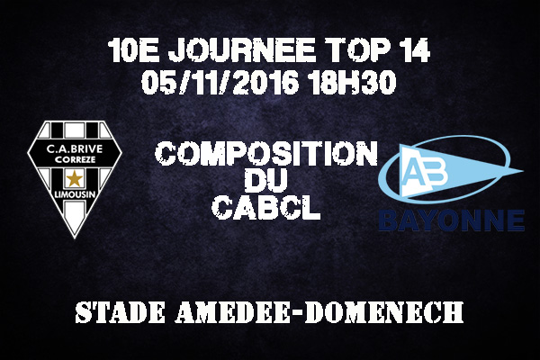 Brive se prépare sans ses internationaux. Mais la plupart sont de retour. Finalement il ne manquera que Julien Ledevedec qui ne pourra jouer (convention FFR/LNR). Wilhelm Steenkamp n'est plus touché à la cheville et postule pour Bayonne. Tout comme Sisa Koyamaibole, le grand absent contre Clermont. Touchés contre Clermont, Fabien Sanconnie est apte pour Bayonne mais Poutasi Luafutu est au repos.