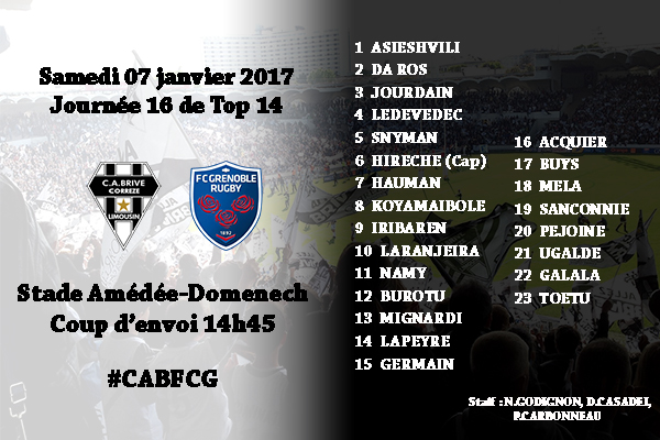 Pour sa première en 2017, Brive ne veut pas se manquer avec cette réception de Grenoble. Défaits à la sirène et rentrés frustrés du déplacement à Paris, les brivistes voudront remettre les points sur les i et repartir du bon pied et ne pas manquer définitivement le bon wagon pour le haut de tableau.