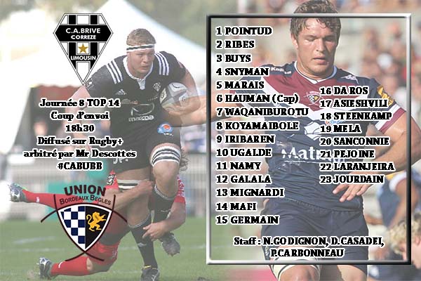 Pour recevoir Bordeaux, le staff briviste fait confiance à une bonne partie du groupe de ces dernières semaines. Guillaume Ribes, Damien Jourdain, Peet Marais et Johan Snyman font leur retour. Le duo Galala - Mignardi est reconduit.