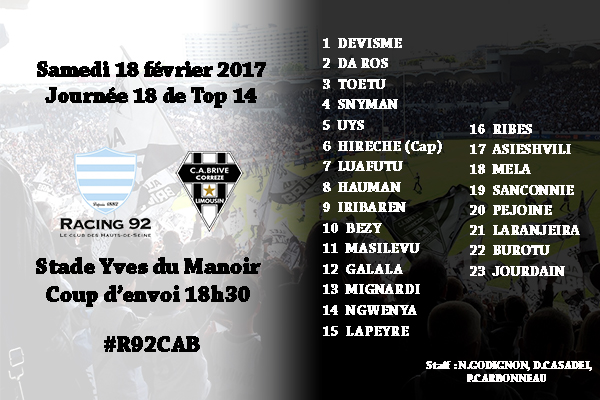 Avant d'attaquer un énorme mois de mars, le CA Brive se déplace au Racing 92 pour son unique match au mois de février. Partis en congés sur une défaite à Bayonne, les brivistes vont devoir redresser la barre contre une équipe parisienne qui veut confirmer après son succès bonifiée contre ces mêmes bayonnais.