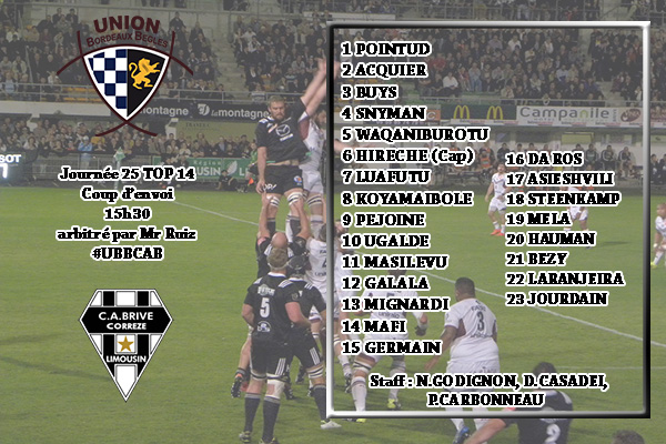 Pour le déplacement à Bordeaux, le staff briviste ne bouleverse pas son XV de départ et fait confiance aux vainqueurs de Grenoble la semaine dernière. Snyman retrouve sa place de titulaire tout comme Buys. Péjoine et Galala remplacent les incertains Iribaren et Petre.