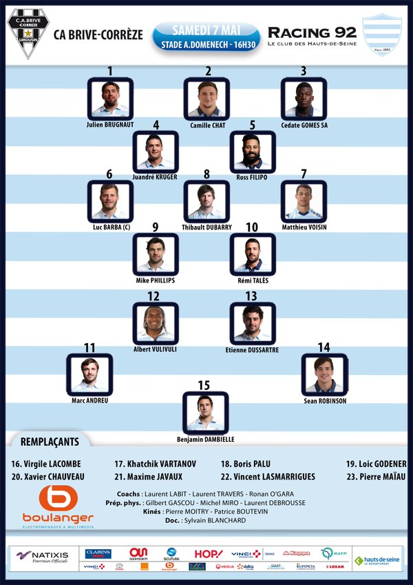 Voici le XV de départ du Racing pour le déplacement à Brive :