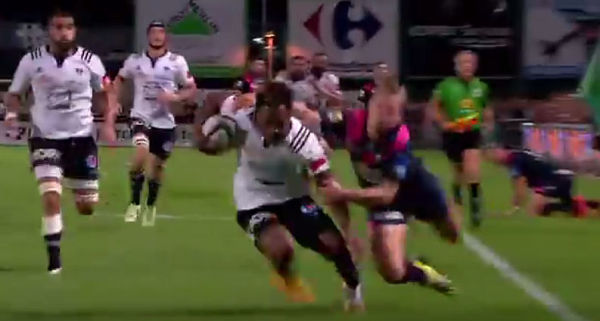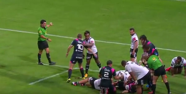 Hier, nous avons décortiqué l'attaque briviste qui amène à cette sanction. Alors qu'il ne se situe plus qu'à quelques mètres de l'en-but, Benito Masilevu se fait reprendre par Jules Plisson. A vitesse réelle, le plaquage haut ne fait aucun doute. Au ralenti, le plaquage est beaucoup moins dangereux qu'il n'y parait. Cependant, Mr Marchat n'a eu aucun doute quant au geste et n'a demandé la vidéo que pour confirmer l'intention de donner un essai de pénalité aux brivistes. Sans ce plaquage à la limite de la règle, Masilevu serait allé au milieu des poteaux.