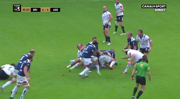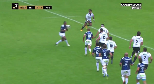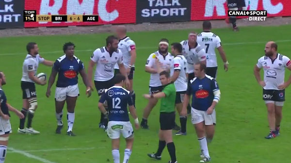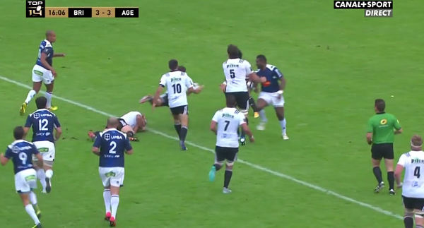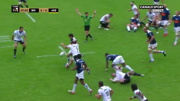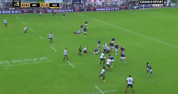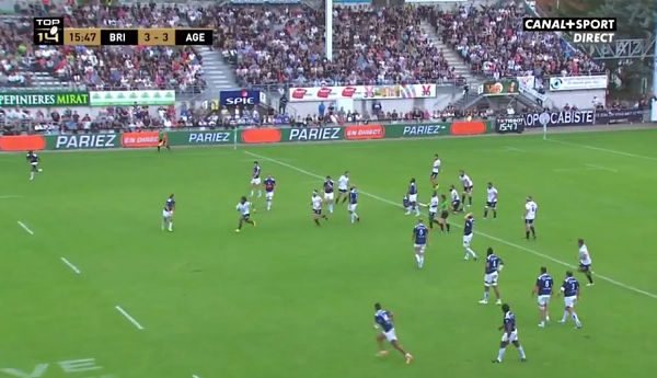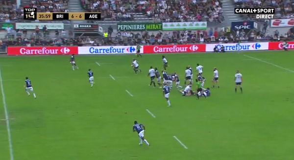 Belle attaque agenaise qui se développe au large. Francis veut transmettre à son centre Narumasa mais la passe est en-avant. Avantage Brive.
