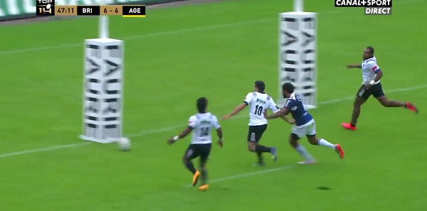 ... qui déchire le rideau défensif adverse à l'aide de ses crochets. Le dernier défenseur agenais relâche son effort au moment du coup de sifflet mais la situation était très dangereuse pour Agen. Si Masilevu efface son adversaire, ça se joue à la course entre lui et les deux ailiers d'Agen. Pourquoi Mr Cardona ne laisse-t-il pas l'avantage ? Petre et Masilevu ne commettent pas de faute. Coup de sifflet beaucoup trop hâtif. Brive aurait dû bénéficier de l'avantage.