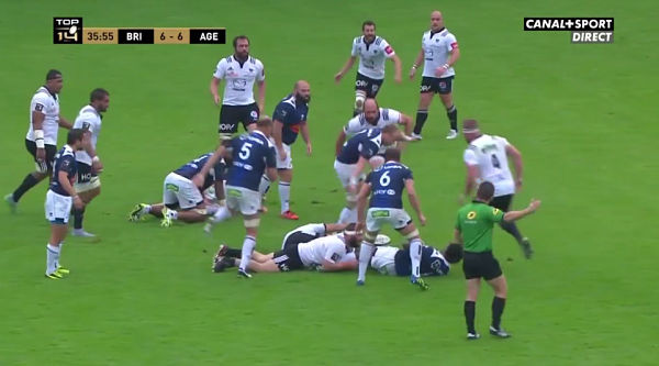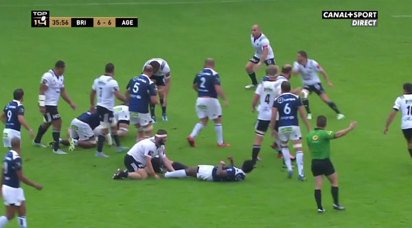 Un briviste se couche sur le ballon mais un agenais vient taper dedans. La balle ricoche sur Peet Marais et prend la direction d'Arnaud Méla.