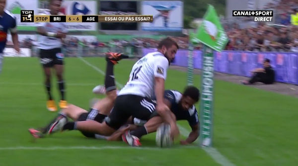 Tilsley s'échappe sur son aile, se défait de Masilevu et résiste au plaquage de Mignardi. Malgré le retour de Petre, il aplatit en coin. Sans certitude, Mr Cardona demande l'aide de la vidéo. L'arbitre vidéo juge que l'ailier agenais commet un en-avant. Ce qui est sûr, c'est qu'il ne touche pas la ligne de touche. Pour l'en-avant, on vous laisse vous faire votre propre avis. Mais accorder cet essai n'aurait pas été scandaleux non plus.