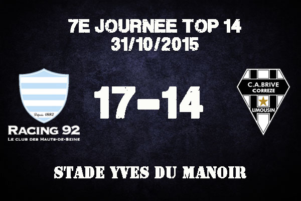 La victoire à Pau a relâché les brivistes avant cette rencontre au Racing. N'ayant rien à perdre et tout à gagner, le CAB attaque ce match sans complexe et s'appuie sur ce qui fait sa force depuis le début de saison : conquête et défense. Le Racing veut faire le jeu, multiplie les temps de jeu mais commet plusieurs en-avants, ce qui ne permet pas d'enchainer. Au contraire de brivistes qui ouvrent le score par Germain. Et le miracle a lieu : Brive marque un essai en première période !!! Grosse séquence briviste et Iribaren sert Galala en coin pour aplatir. La mêlée continue son travail de sape. Germain rajoute deux pénalités et le Racing écope même d'un carton jaune (Tameifuna). Juste avant la sirène, Machenaud inscrit les premiers points de son équipe. A la pause, Brive mène 14 à 3 en toute logique. En seconde période, le CAB est toujours aussi bien en place mais petit à petit, le banc du Racing commence à faire la différence. Les brivistes essaient d'occuper le camp adverse mais ne parviennent plus à obtenir des occasions de marquer des points. Au contraire du Racing qui commence à enfin jouer à l'heure de jeu. Les internationaux français Szarzewski et Ben Arous sont à la conclusion d'une belle attaque parisienne. Le pilier relance son équipe (10-14, 63'). Brive commence à manquer d'essence dans le moteur et se met à la faute sous la pression plus grande des racingmen. Thomas Acquier écope d'un carton jaune (72'). A la suite d'un maul collectif (avants + 3/4), c'est Marc Andreu qui inscrit l'essai de la victoire du Racing qui passe pour la première fois devant au score (17-14, 73'). Brive va écoper d'un nouveau carton jaune (Luafutu, 75') mais va malgré tout parvenir à sceller ce score de 17 à 14.
