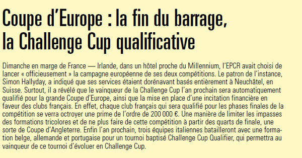 Le deuxième point est plus étrange : une prime de 200 000 € donnée à chaque club français se qualifiant pour les phases finales de la Challenge Cup. Si cela peut être intéressant pour des clubs comme Brive, que vont en penser les clubs anglais, irlandais, écossais, gallois ... ? Cette prime peut surtout motiver encore plus les clubs adversaires des français lors de rencontres décisives dans les poules respectives?