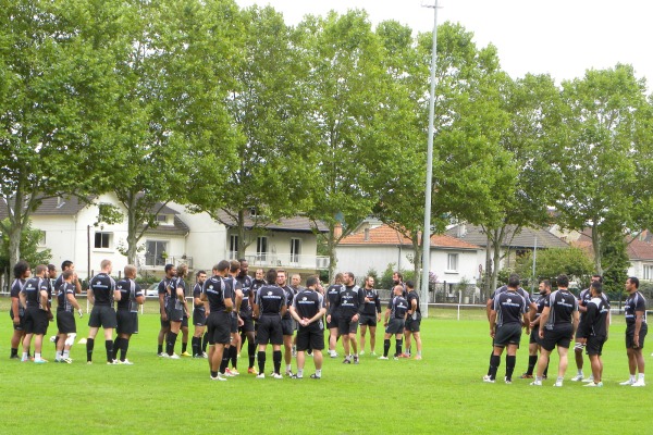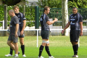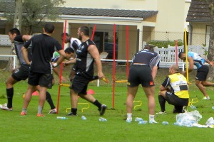 L'entrainement est découpé en trois parties. La première partie est réalisée en plusieurs ateliers. Mené par Didier Casadéï, ancien pilier devenu demi de mêlée, les joueurs travaillent le jeu de passes au près et le soutien. On passe ensuite sur l'atelier déblayage et rapidement sur l'atelier défense en ligne mené par Nicolas Godignon.