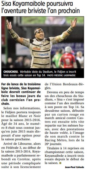 Depuis quelques semaines, il y a une tradition au CAB : match à l'extérieur signifie annonce de transferts au club. Donc, avant ce déplacement à Oyonnax demain, ce n'est pas une mais deux informations qui font parler de Brive dans les journaux nationaux et régionaux. Nous avons au menu une prolongation et une arrivée probables.