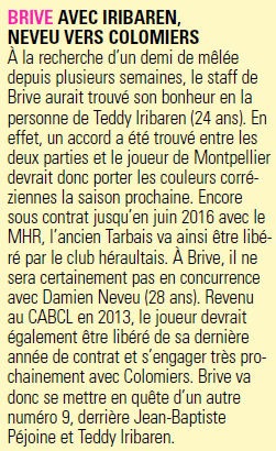 Le départ de Damien Neveu est une rumeur qui grossit semaine après semaine. Formé à Brive et passé par La Rochelle, le demi de mêlée devrait retrouver la Pro D2 au club de Colomiers. Pour le remplacer, après avoir sondé Alexi Balès (Agen) et Julien Audy (La Rochelle), Brive devrait s'orienter vers le jeune montpelliérain Teddy Iribaren (24 ans). Formé à Toulouse mais révélé à Tarbes, il est la doublure de Benoit Paillaugue au MHR (12 matchs pour 6 titularisations).