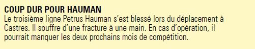 Le lendemain, France Bleu Limousin complète le bulletin médical et annonce une absence d'un mois car l'opération n'est pas nécessaire. Avec cette absence, Hauman a manqué la réception de Pau et va manquer le déplacement à Toulouse, la double confrontation contre Enisei en Challenge Cup. Est ce qu'il sera de retour pour les 2 derniers matchs de Top 14 en 2016 contre Lyon et le Stade Français ? Ça risque être juste, tout dépendra de la vitesse de récupération de son organisme.