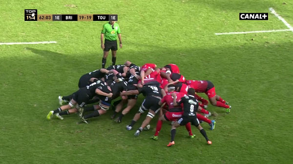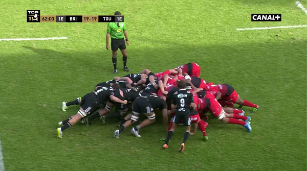 Nous sommes à l'heure de jeu, sur la ligne médiane. Le score est de 19 partout. Brive est dans un temps fort et vient d'infliger un 10-0 à Toulon. Le RCT a l'introduction pour cette mêlée qui doit permettre aux toulonnais de réinvestir le camp briviste et peut être reprendre le contrôle de la partie.