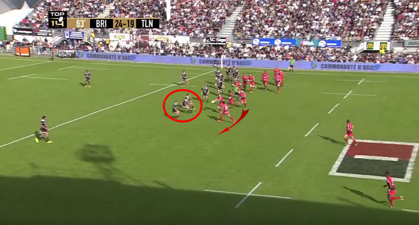 Le demi de mêlée sert son ouvreur Ugalde qui lance le contre (car Brive était placé en mode défense). Alfie Mafi arrive lancé à son intérieur. Situation de 2 contre 2 : Ugalde / Du Plessis et Mafi / Pelissié.