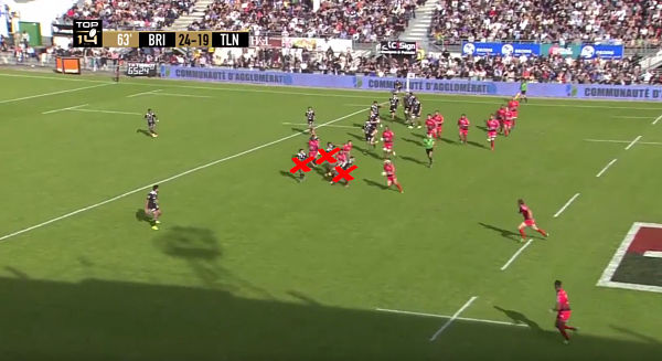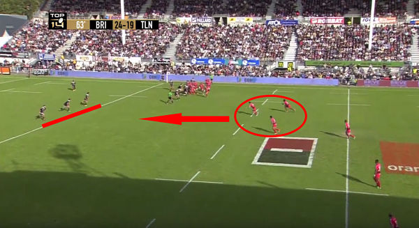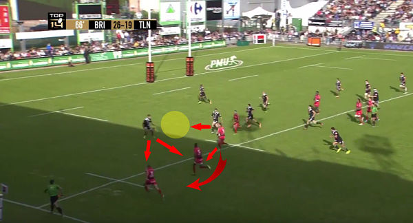 Le centre du terrain briviste est éliminé sur cette action. Le tableau noir du RCT a parfaitement fonctionné. Le surnombre est en place sur les extérieurs : 4 attaquants - 2 défenseurs. Normalement ça doit faire essai.