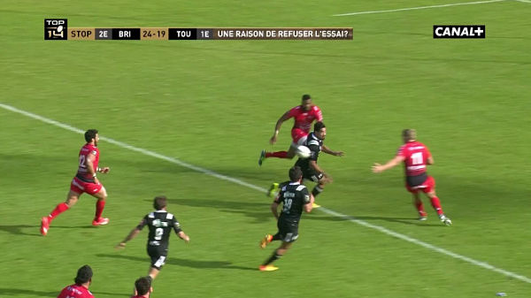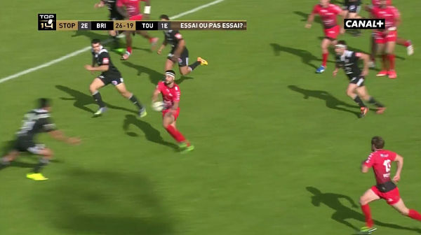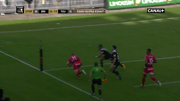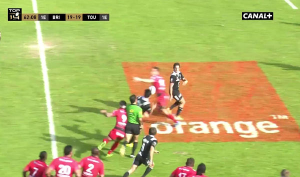 Après l'essai briviste, la réaction toulonnaise ne se fait pas attendre. Le RCT bénéficie d'une très belle touche à une trentaine de mètres de l'en-but de Brive. Touche complète bien captée et aussitôt transmise à Pélissié. Deux trios se positionnent au centre du terrain : d'une part Du Plessis - Mermoz - Tuisova et d'autre part Ugalde - Laranjeira - Mignardi. Sauf qu'il reste seulement 2 défenseurs brivistes (Germain et Mafi, qu'on ne voit pas sur l'image) contre 3 attaquants varois (Belan, Armitage, Turner). Mauvaise répartition de la défense ?