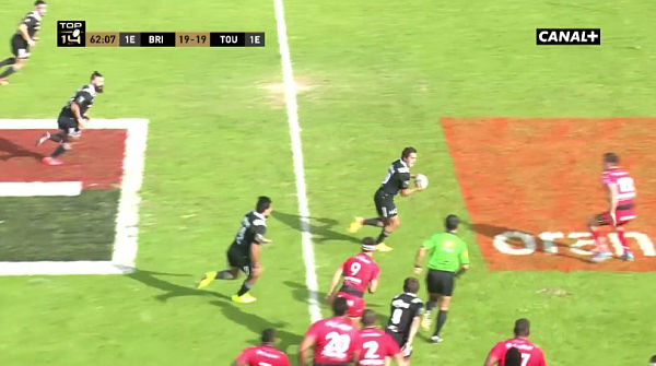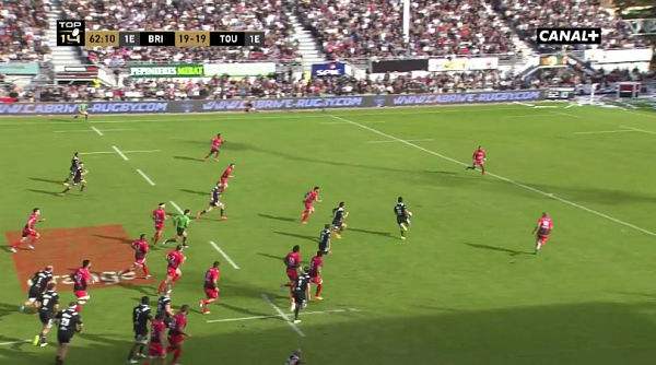 L'ailier australien zigzague pour trouver un espace à l'approche des 22 toulonnais. Armitage et Turner assurent le dernier rideau. Côté Brive, Iribaren et Ugalde, après avoir lancé l'attaque, se portent au soutien de leur coéquipier et vont tenter de lui proposer la meilleure solution possible.