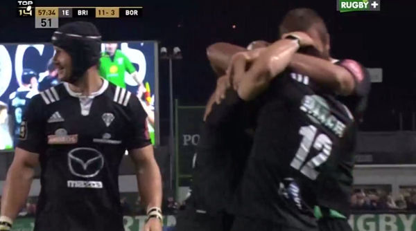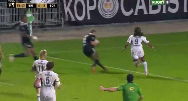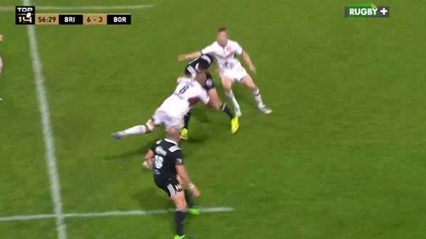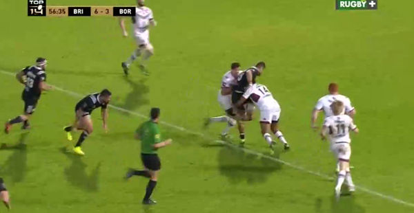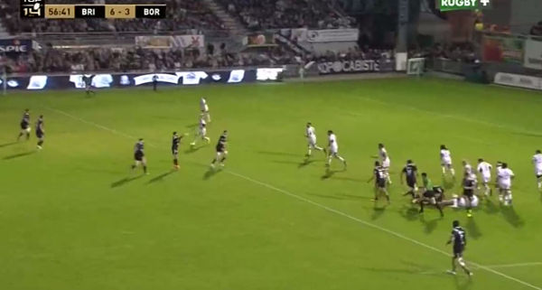 Finalement, Mafi choisit la sécurité et sert Germain qui arrive en soutien. L'arrière briviste est repris par la défense mais parvient à rentrer dans les 22 bordelais pour créer un regroupement.